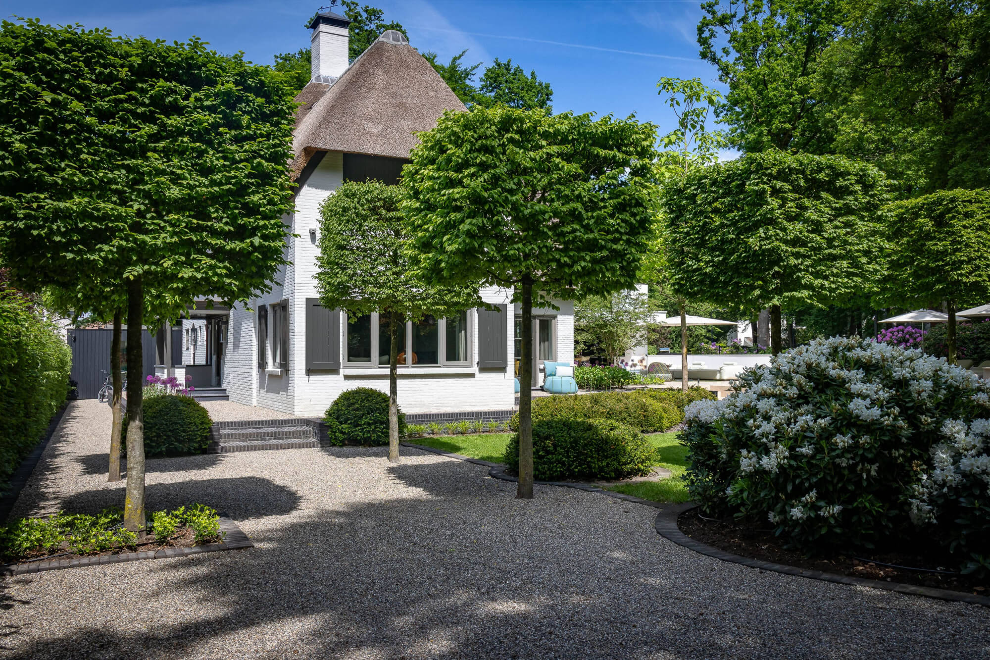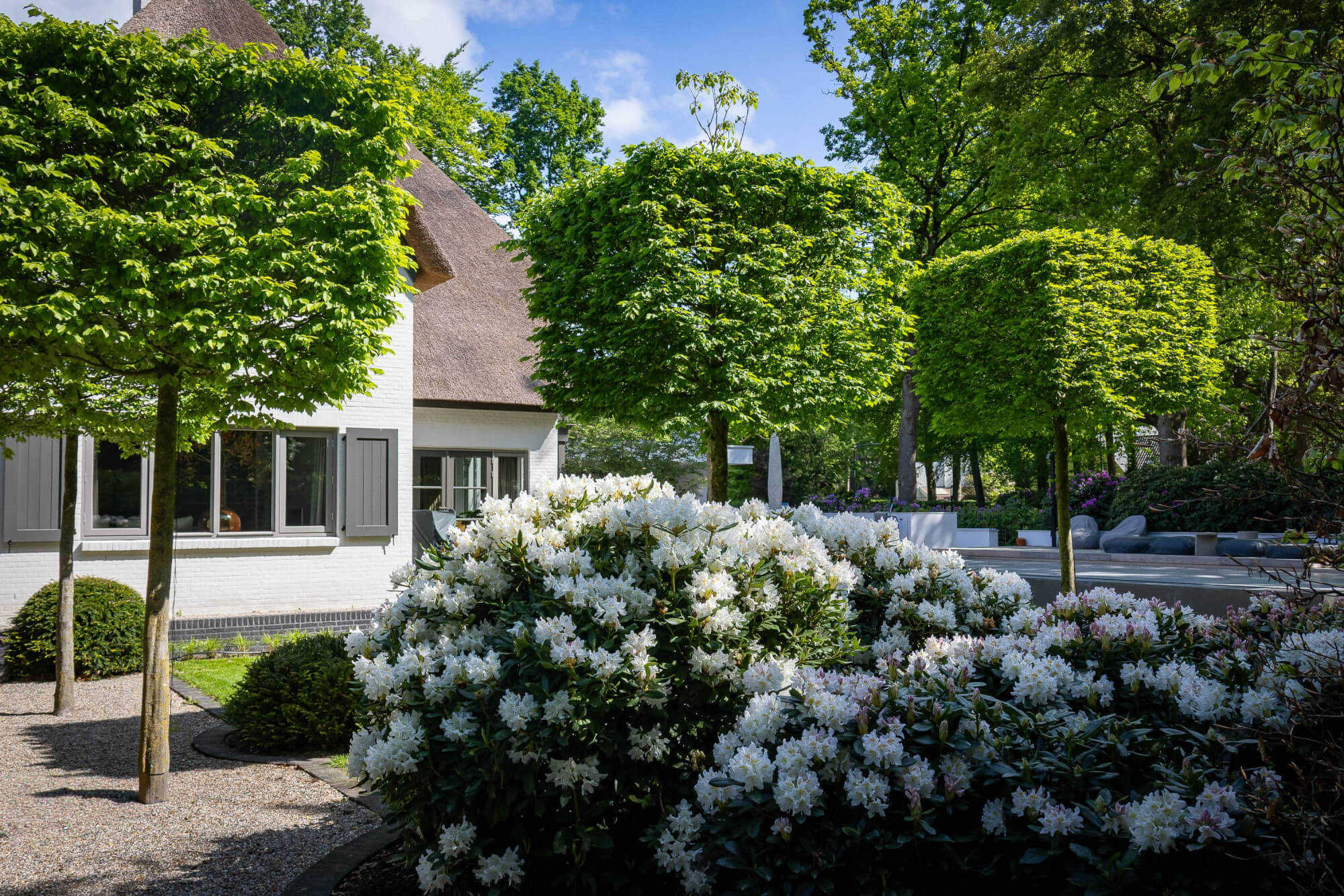Aan de rand van het bos gaat de de tuin op natuurlijke wijze over in de aangrenzende natuur. Mede door de toepassing van de mooie Rhododendronwal. Onderhoudsvriendelijk en altijd stijlvol!
