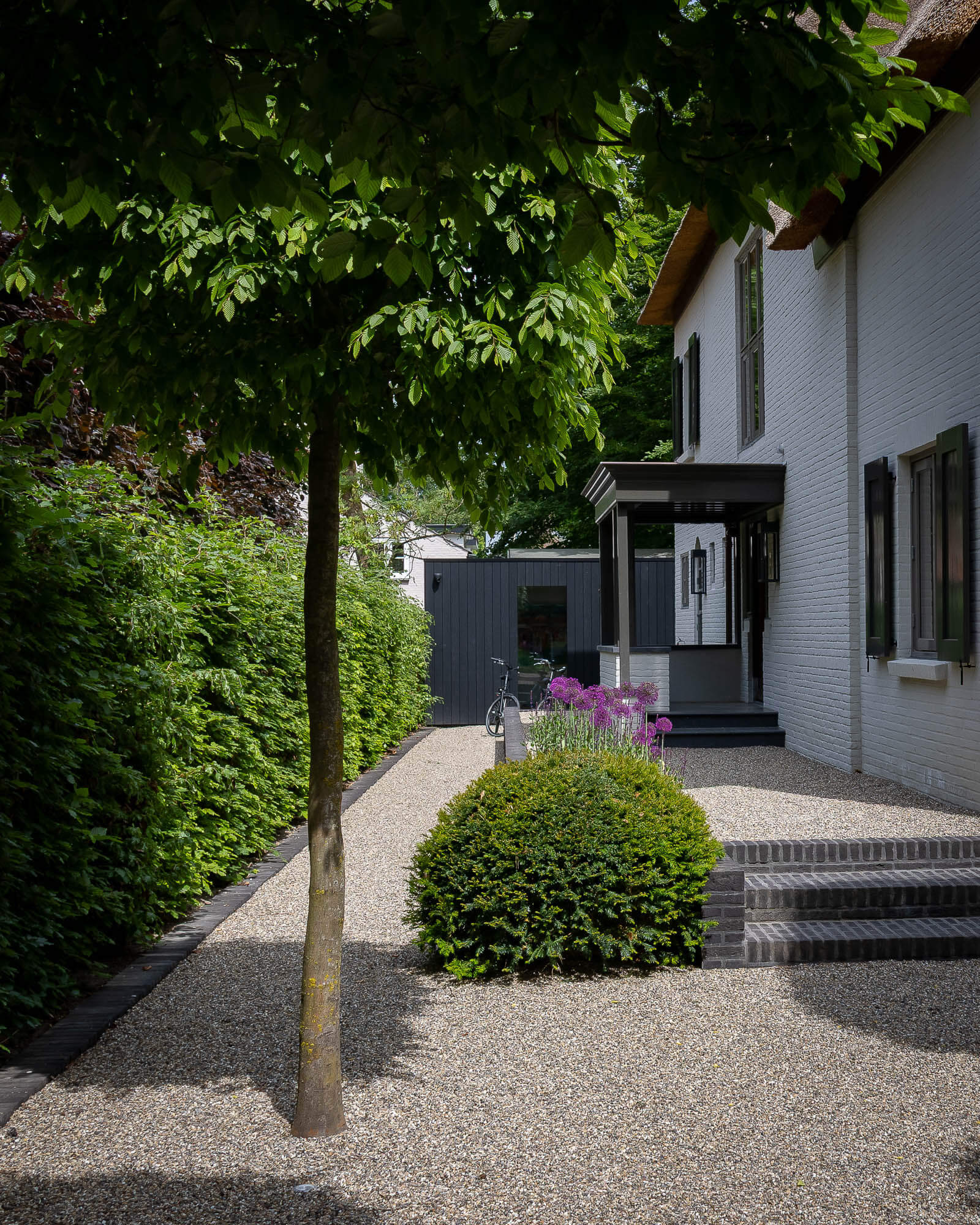 Een mooie natuurlijke uitstraling geeft het fijne split dat toegepast is in de paden en oprit. Verstevigd door middel van stabilisatieplaten is het ideaal om over te lopen of de auto op te parkeren. Netjes afgewerkt met rollagen van gebakken klinkers waardoor het onderhoudsvriendelijk is. Samen een prachtig geheel met een hoog leefgenot.